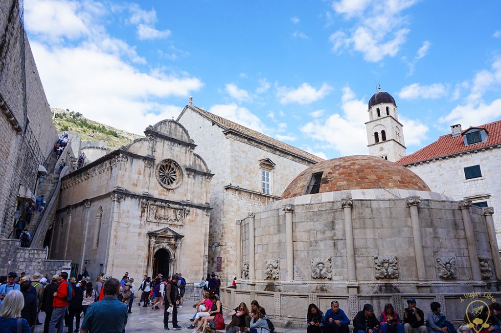 Nada más pasar la Puerta Pile estamos en una bonita plaza, donde destaca la circular Fuente de Onorio (4 en el mapa), construida en el siglo XV para conmemorar la finalización de la construcción de un acueducto que sirvió para dotar de agua a la ciudad. Beber agua de esta fuente es de las pocas cosas que puedes hacer gratis en Dubrovnik.